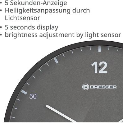 &iex; Dise ñ or simple and timeless! Whether at home or in the office, the BRESSER MyTime LEDsec wall clock is great everywhere. It combines a reduced physical appearance with a modern LED screen, and in many color variants. The hours and minutes are almost silent in silence for the silent and slow mechanism of the clock on the large sphere of 24 cm. &iex; For a sue ñ or guaranteed quiet or a concentrated job without that annoying tic-tac! And as each moment counts, the seconds screen lights up every 5 seconds.