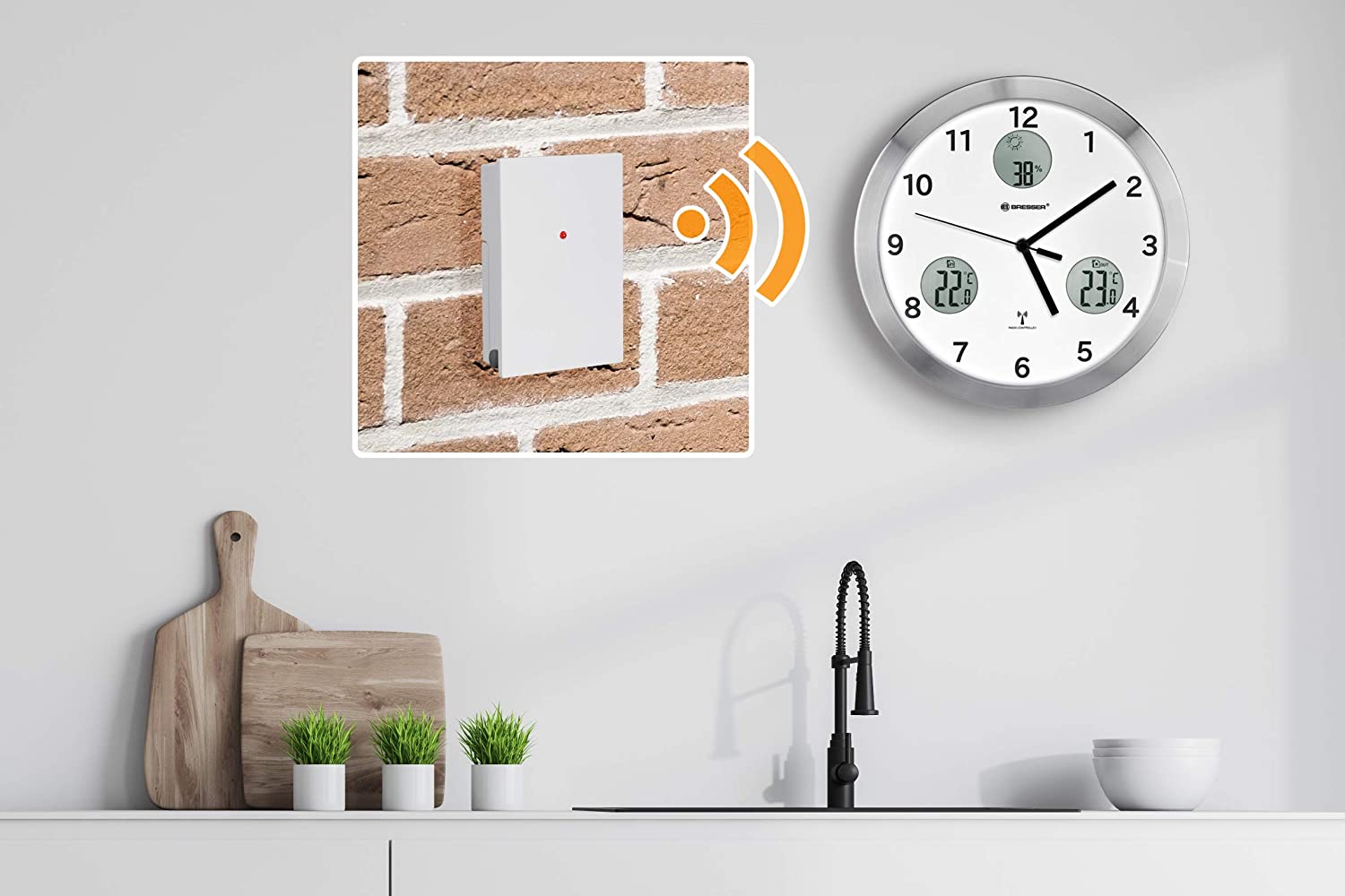 The BRESSER MyTime io wall clock shows, in the time controlled by ñ the DCF, the internal and external temperature, as well as the ambient humidity and a time preview. The exterior sensor (s) allows the transmission of the outside temperature up to a range of 30m (in open).
