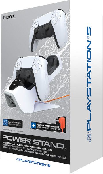 The bionik feed support for PlayStation 5 has dual load and a display base for up to 2 wireless DualSense commands. The present invention relates to a method for providing the load current for load times m &aecas r &aplies using a AC adapter against a charge of USB-C cable from the PS5. This feed support includes a dual charger, AC power adapter.