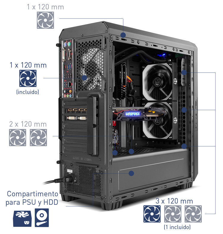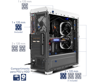 It has a compartment at the bottom to locate the PSU and the HDD, so that the heat released by them is not transferred to the other components. In addition, this compartment has the possibility of installing two 120 mm fans at the top to extract the heat generated by the PSU and the HDD.