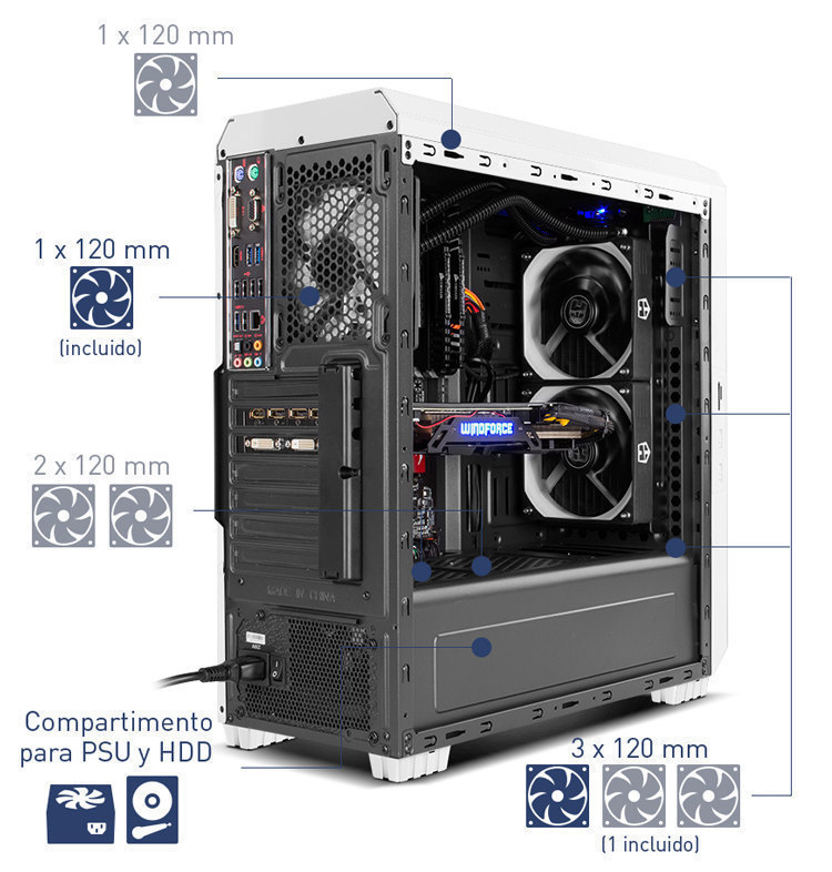 It has a compartment at the bottom to locate the PSU and the HDD, so that the heat released by them is not transferred to the other components. In addition, this compartment has the possibility of installing two 120 mm fans at the top to extract the heat generated by the PSU and the HDD.