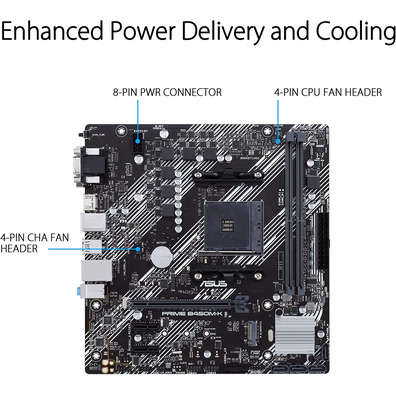 Prime B450M-K II is ñ ada with a series of fan connectors h íbras and features integral cooling controls that can be configured to bring the Fan Xpert 2 + software or the UEFI BIOS, ensuring that your computer stays cool and stable under intense workloads.