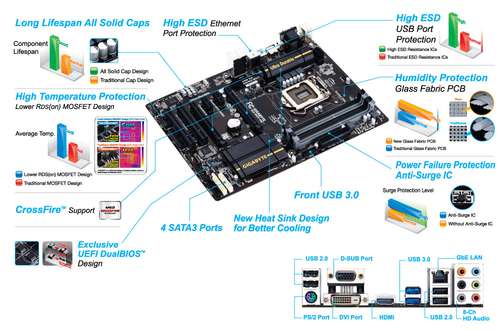 Gigabyte GA-B85-HD3. compatible memory types: DDR3-SDRAM, Type of memory slots: DIMM, Memory channel support: Dual. processor family: Intel, compatible processor: Celeron, Core i3, Core i5, Core i7, Pentium, processor socket: Socket H3 (LGA 1150). Support hard drive interfaces: SATA, serial ATA II, serial ATA III. HDMI version: 1.4. Component for: PC, Family of stem card components: Intel, Integrated stem card circuit: Intel B85