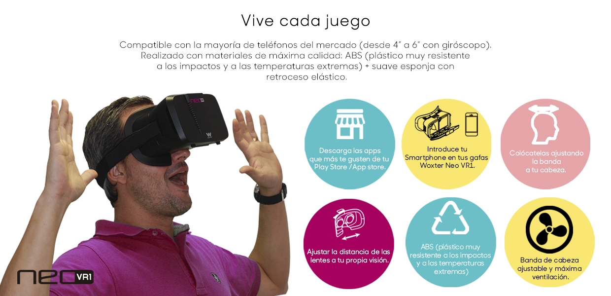 If the Oculus Rift or HTC Viva get away from the budget, take your smartphone and the new Woxter Neo VR1 virtual reality glasses designed for phones from 4 "to 6" that incorporate gyroscope. Feel the most amazing speed, vibration and sound effects with these glasses that will help to make the immersion into your games complete.